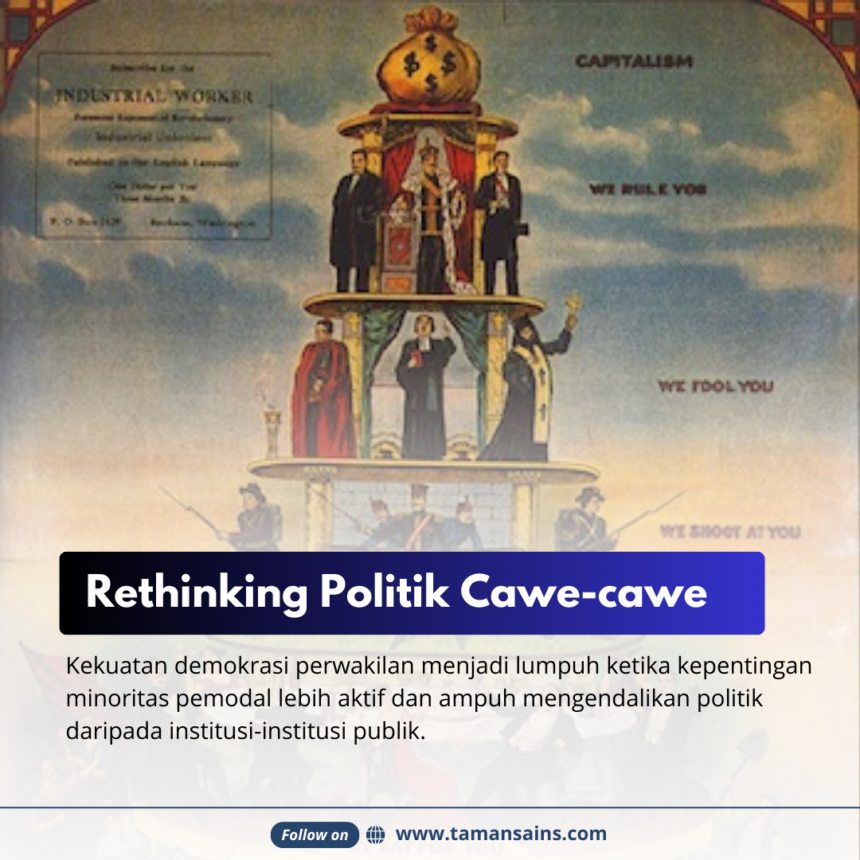 Kekuatan demokrasi perwakilan menjadi lumpuh ketika kepentingan minoritas pemodal lebih aktif dan ampuh mengendalikan politik daripada institusi-institusi publik. Demokrasi tidak lagi menjadi sarana efektif bagi kekuatan kolektif mengendalikan kepentingan perseorangan, malahan bisa berbalik arah menjadi sarana efektif bagi kepentingan perseorangan untuk mengontrol institusi dan kebijakan publik; res publica (urusan umum) bisa ditundukkan dibawah kendali res privata (urusan privat).